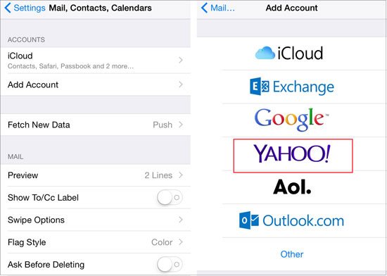 1. 在 iPhone 上,转至设置>邮件、通讯录、日历>添加帐户> 选择Yahoo!并使用您的雅虎邮件帐户和密码登录。