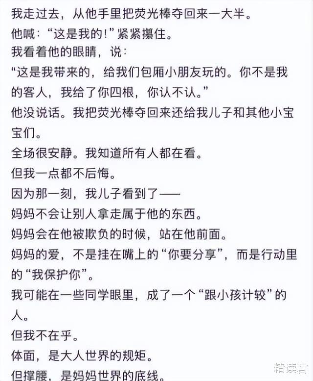 另一个故事来自网友分享:她七岁的儿子在游乐场抢了小朋友的玩具,对方妈妈没有发火,只是蹲下来对她儿子说: