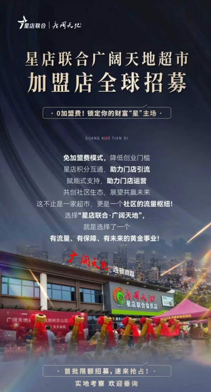 广阔天地,大有可为!从破解行业痛点到创新加盟模式,从赋能个体创业到助力社区商业升级,星店联合・广阔天地超市的加盟招募,不仅是一次商业合作的启幕,更是一场推动社区商业高质量发展的实践。随着首批加盟店的筹备启动,我们有理由相信,在不久的将来,更多“广阔天地超市”将扎根社区,以便利、优质的服务点亮居民生活,也以稳健、可观的收益,助力更多创业者实现财富梦想!