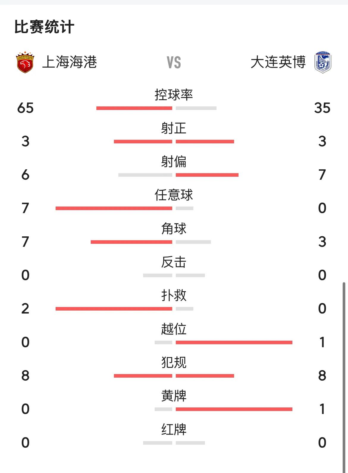 从技术统计上看,确实海港65%的控球率属于完全的压制,任意球双方是7:0,也是海港队完全控制了局面。