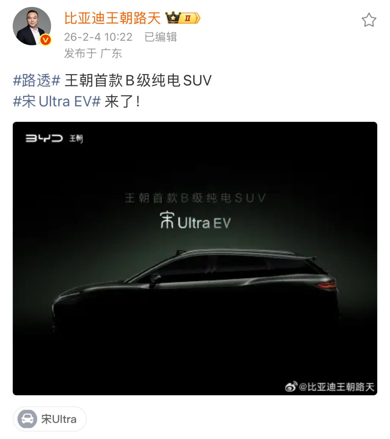 刚刷到比亚迪王朝网销售总经理路天的微博,王朝首款B级纯电SUV宋Ultra EV官宣了!作为比亚迪宋系列的“老粉”,我瞬间来了精神——这次的新车,怕是又要带来惊喜了。