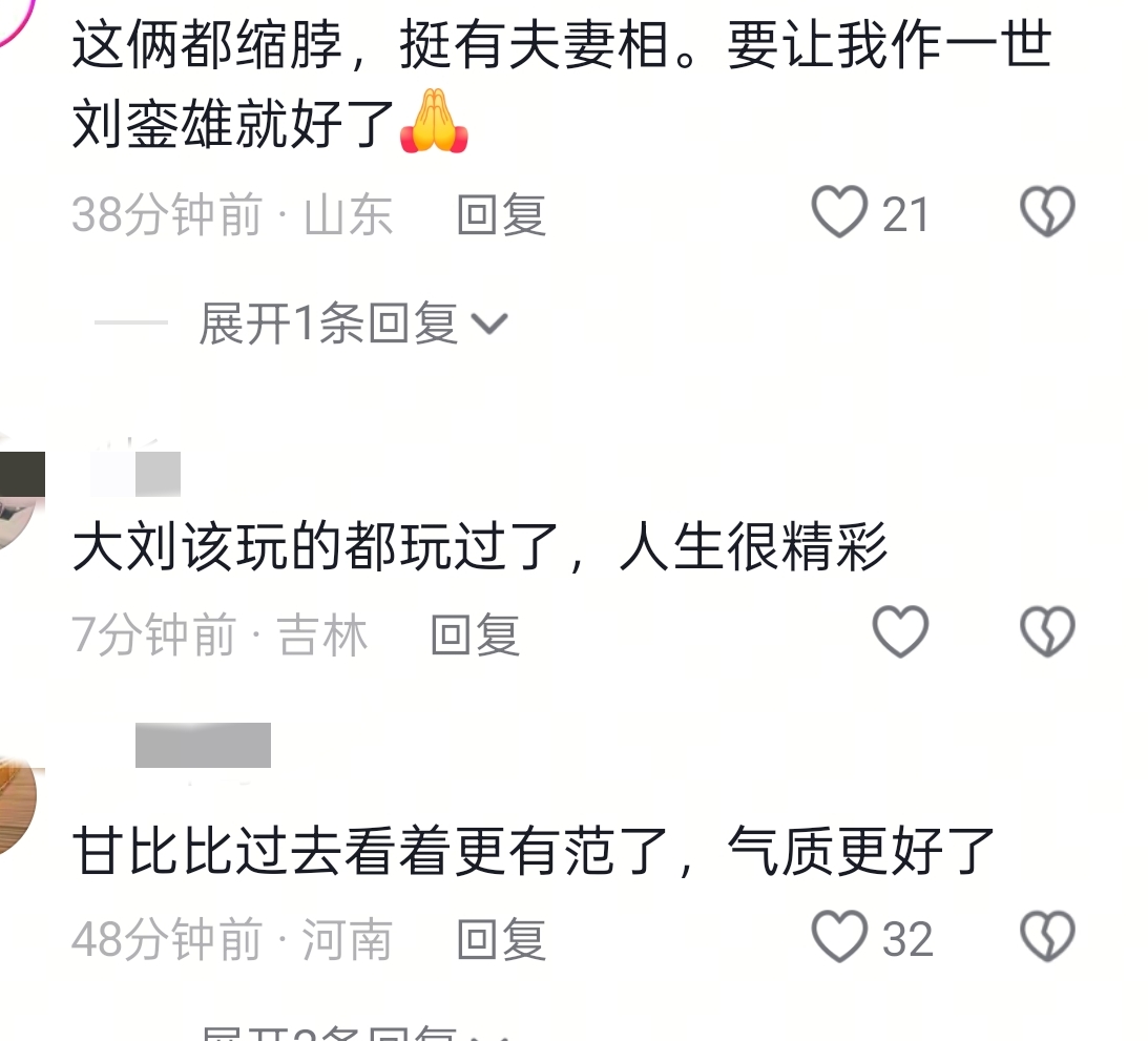 网友们还细心的发现刘銮雄和甘比长得越来越像了,特别是眼神和动作,俩人几乎是同频的状态,不说俩人是夫妻,还以为是父女呢,这大概就是夫妻相了。