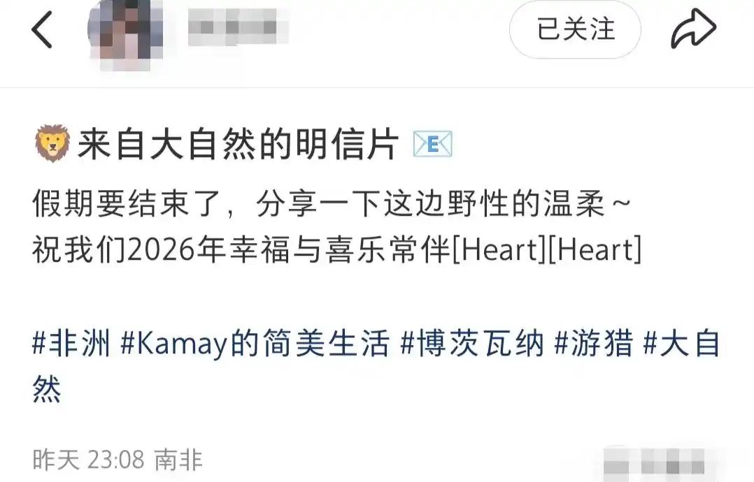 目光敏锐的网友察觉到,嘉美在展示照片之际,暗地里秀了一回甜蜜爱意,甜蜜程度满溢。于她镜头所呈现的视角中,黄轩有时手里拿着相机,全神贯注地拍摄远方的狮子,神情严肃且专注;有时坐在小船之上,沿着河道慢慢前行,全身心沉浸于感受南非的自然景致。