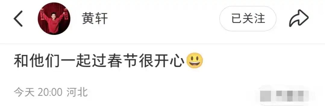 在另一边,黄轩同样更新了社交动态,那文案十分简洁同时还带着温暖,内容是“和他们一起过春节很开心”,其中藏着满满的幸福感。
