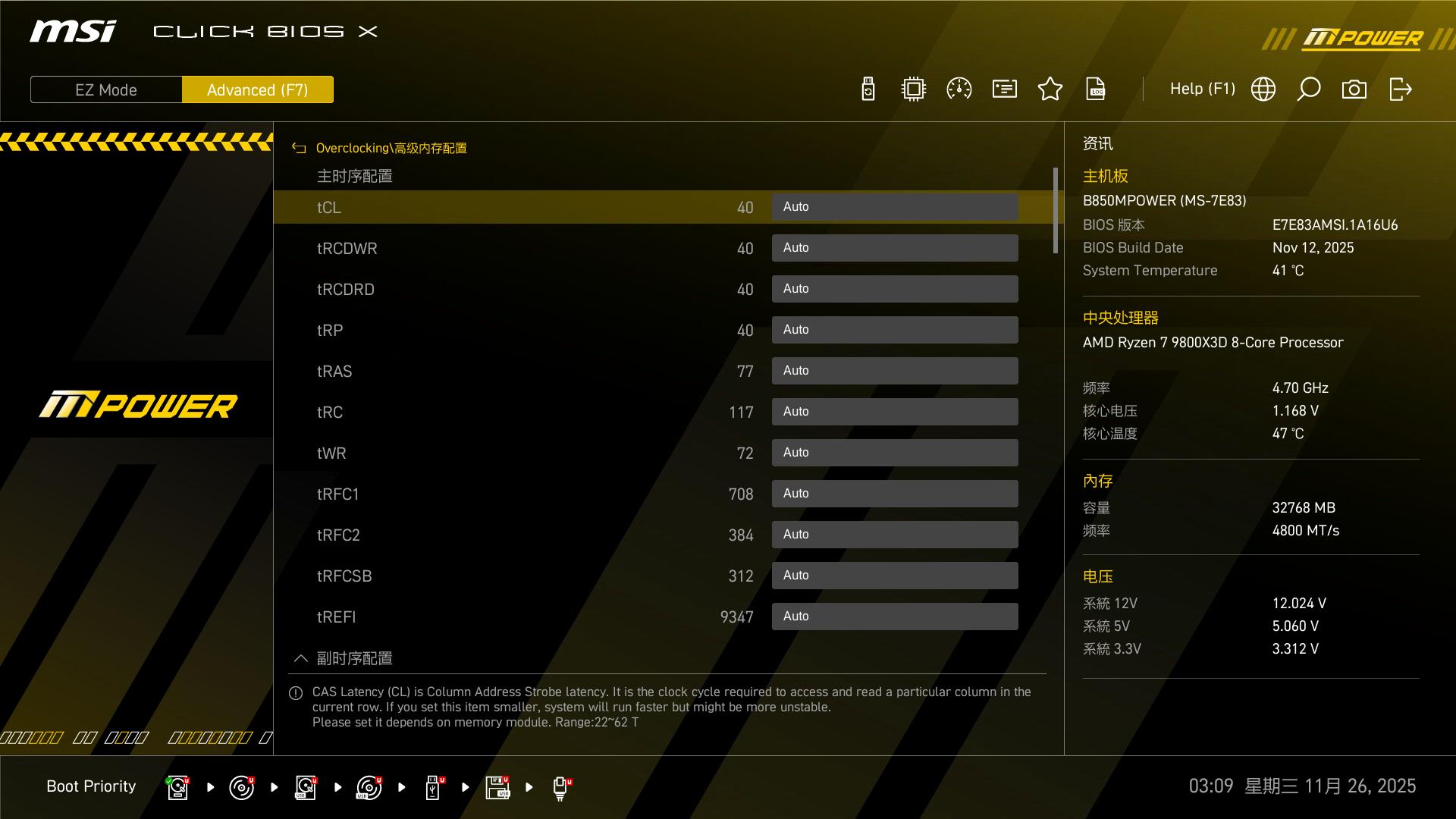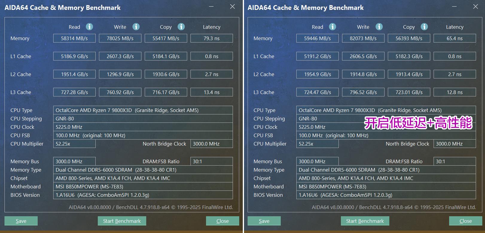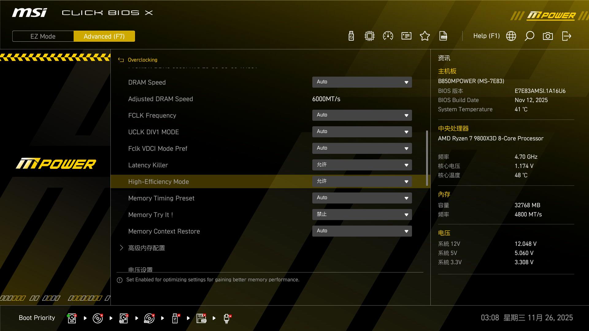 AMD Zen架构对内存频率和时序的搭配比较敏感,通常存在一个“甜点”频率(一般是6000MHz CL26或CL28),能发挥出这套内存的最佳表现,继续提高频率与性能的提升并不成正比。不过,作为一款超频主板,必须压榨出微星B850MPOWER的该有的价值!