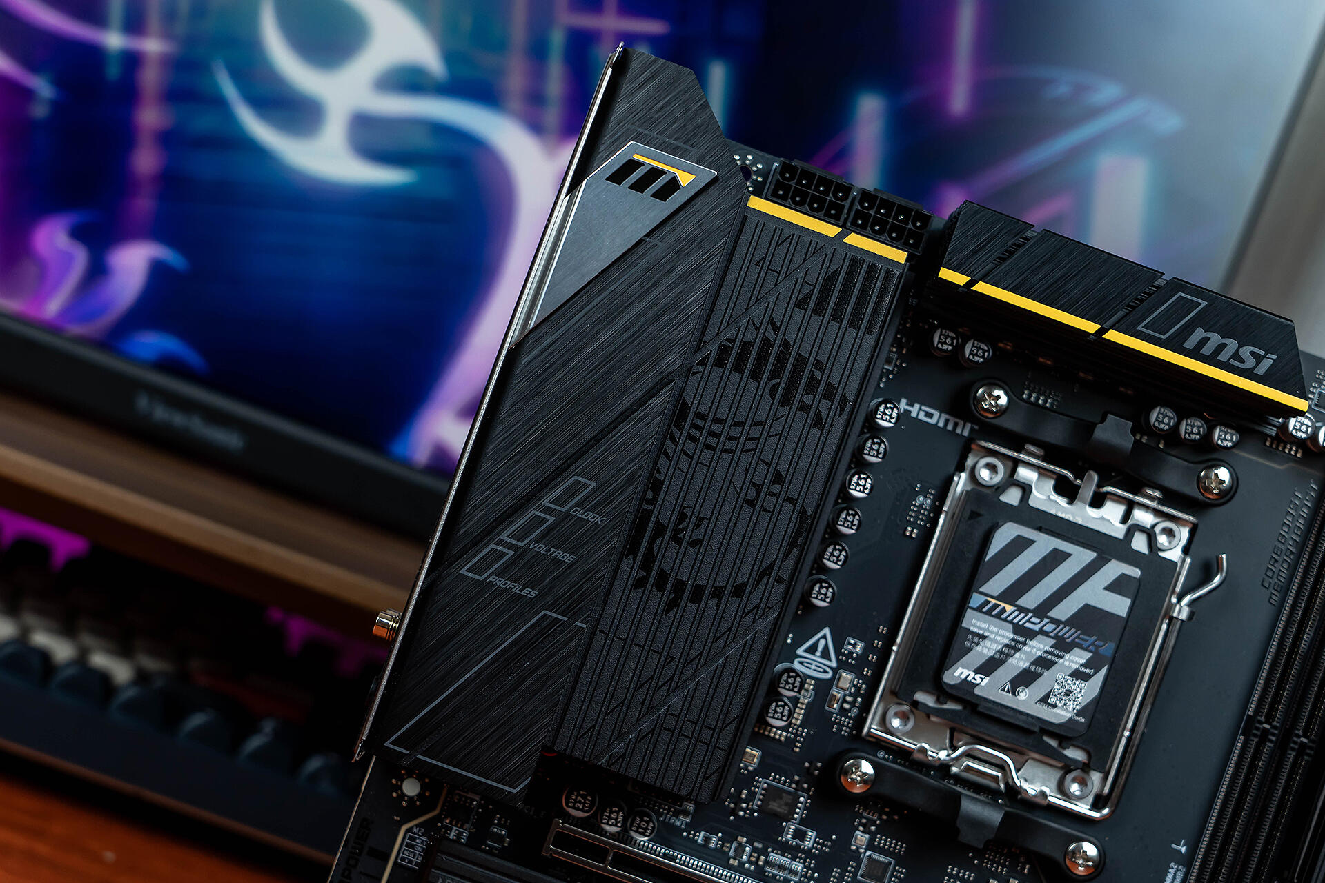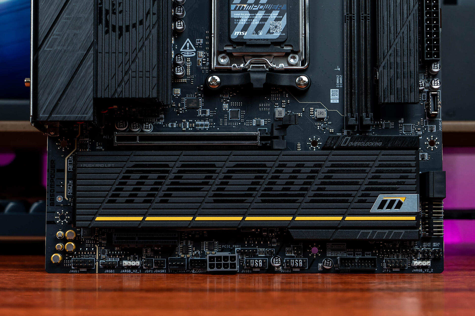 主板上下各点缀了一条黄色装饰条,左上角I/O装甲和右下角M.2冰霜铠甲处都有一枚亮面金属打底的“M”字样,打破了全黑造型的单调。