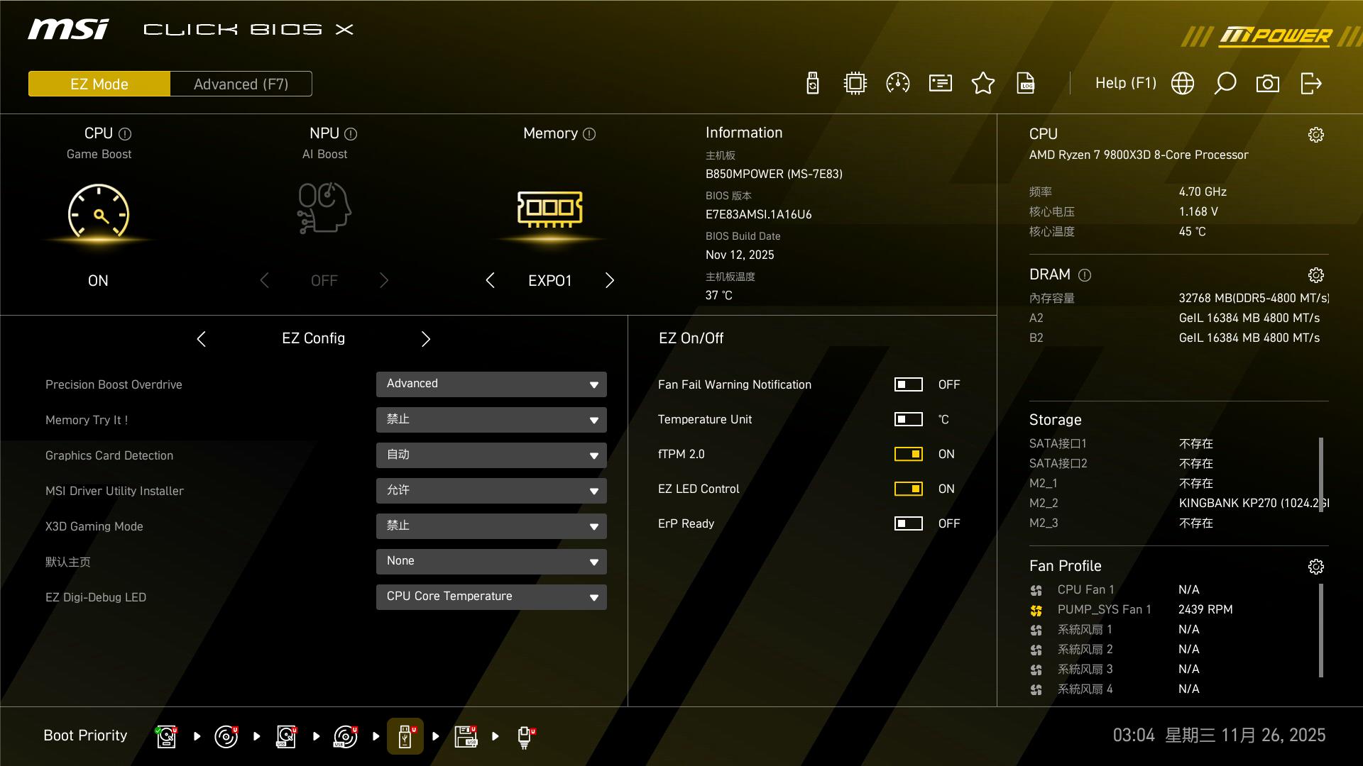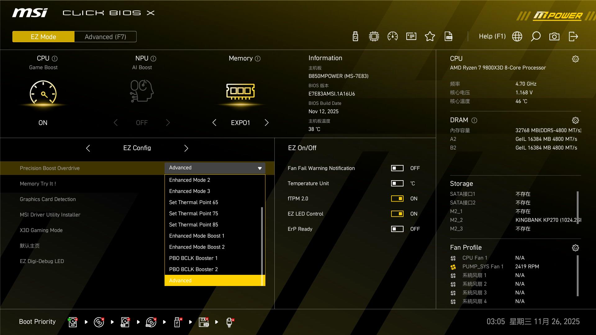 ● 上半部分集成了CPU Game Boost(CPU一键超频)、NPU AI Boost(NPU一键加速)、Memory(内存一键超频)三大功能,无需深入子菜单即可快速调整核心设置,适合新手和小白用户。