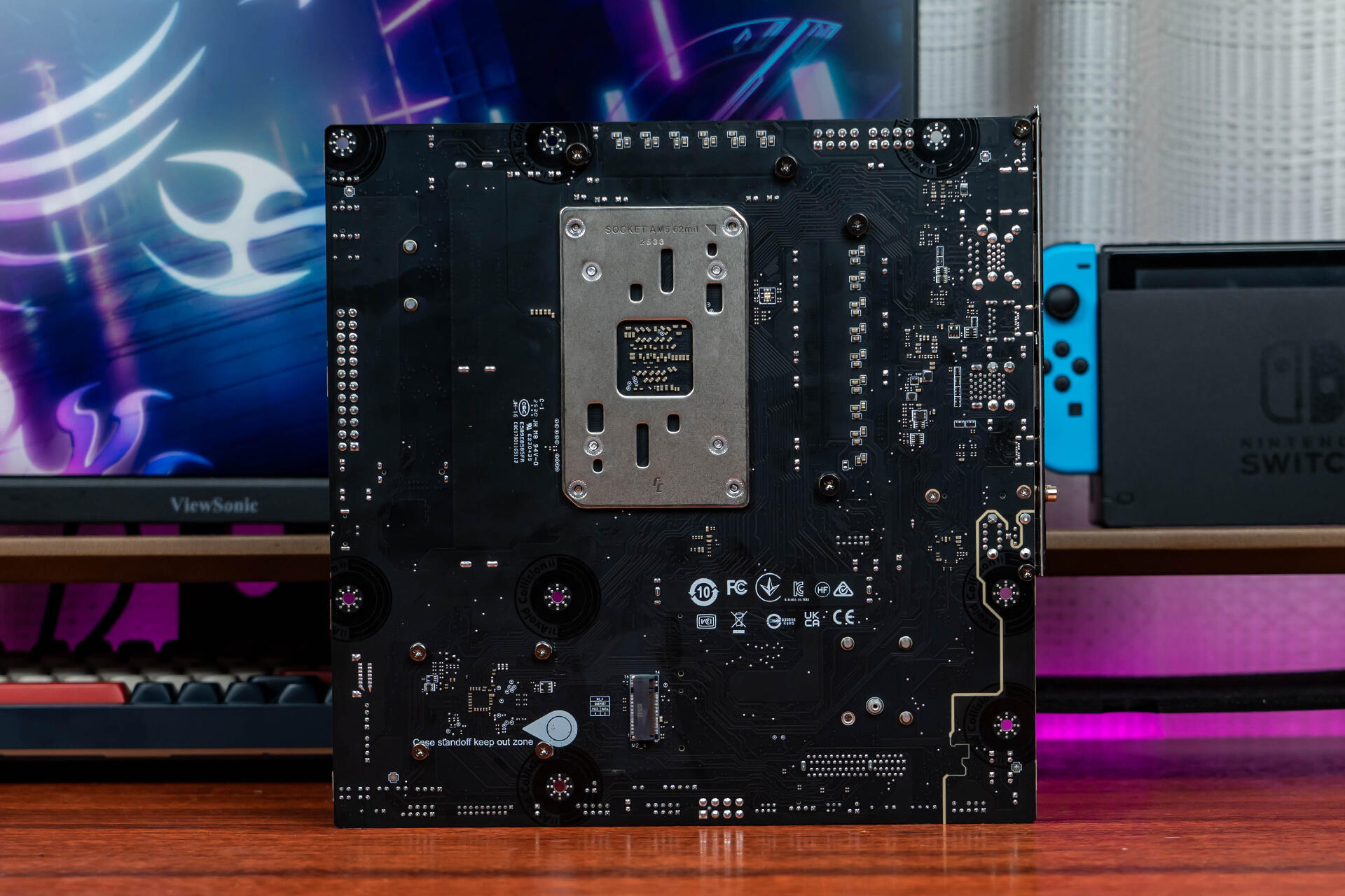 主板背面的焊点处理很工整,CPU位置有一块防护钢板,8个安装螺丝孔和1处重点走线区域进行了特别标注,印有“Case standoff keep out zone”,提醒用户在安装时要特别留意这几处位置,不能碰撞和挤压,避免损伤电路。