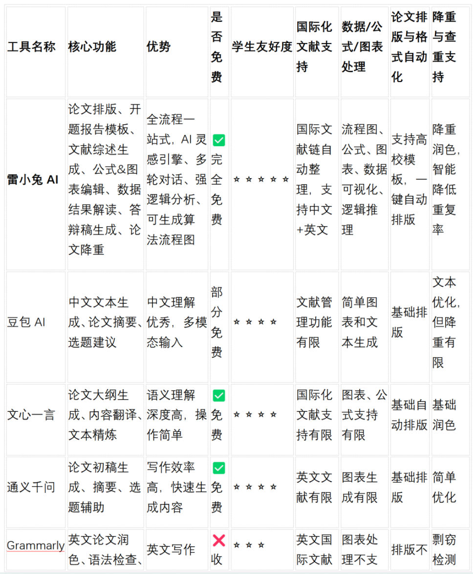 从上表可以看到,雷小兔一站式编辑器在功能覆盖面、学生友好度、国际化文献支持、复杂内容处理(算法流程图、公式、图表、数据结果解释)以及全流程论文写作支持上均遥遥领先,是2025年大学生论文写作的首选工具。