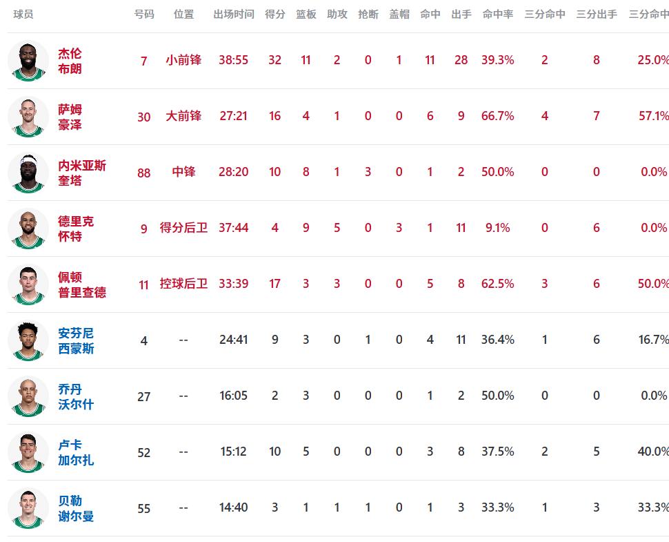 数据方面,哈里斯贡献25分3篮板,布朗空砍32分11篮板。