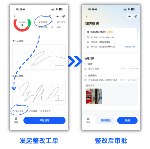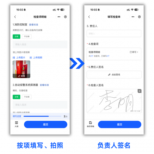 负责人填写表单,可通过文字、图片对门店消防情况进行如实记录。还可收集负责人、检查人签名,实现责任到人。