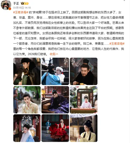 1月15日,编剧于正在社交平台发布长文回顾创作历程,直言“《玉茗茶骨》是我人生的代表作,我以它为荣”,字里行间满是对这部作品的珍视与自豪。这份高调表态,叠加剧集双平台6亿播放量、近852次全网热搜的亮眼战绩,瞬间引发热议,有人认可其创新突破,也有人质疑口碑与热度失衡,让这部开年大剧再度站在舆论风口。