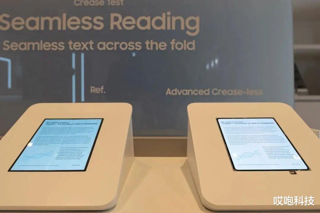 跟三星目前的折叠屏 Z Fold 7 来做对比,就能发现,虽然 Fold 7 的折痕相比之前已经淡化很多,但依然能用肉眼看到;新款无折痕屏幕就真的是一整块玻璃了。