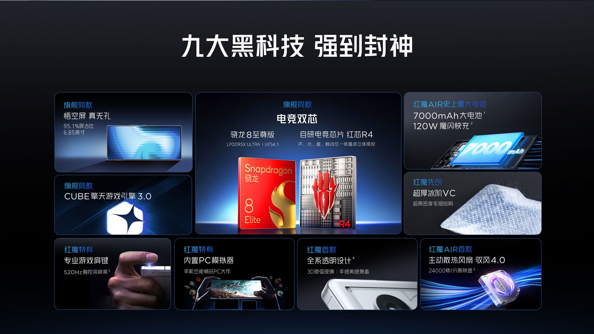 红魔11Air搭载骁龙8Elite旗舰芯片,与最新的自研红芯R4组成旗舰双芯,存储规格升级为LPDDR5X Ultra和UFS4.1,顶配版仅为16GB+512GB稍显遗憾。在这价位段,红魔11Air并没有选择第五代骁龙8,而是坚持使用骁龙8Elite旗舰芯,这一点还是挺值得点赞的。机身三围是163.82*76.54*7.85毫米,重量为207克,有量子黑和星尘白两个配色可供选择。