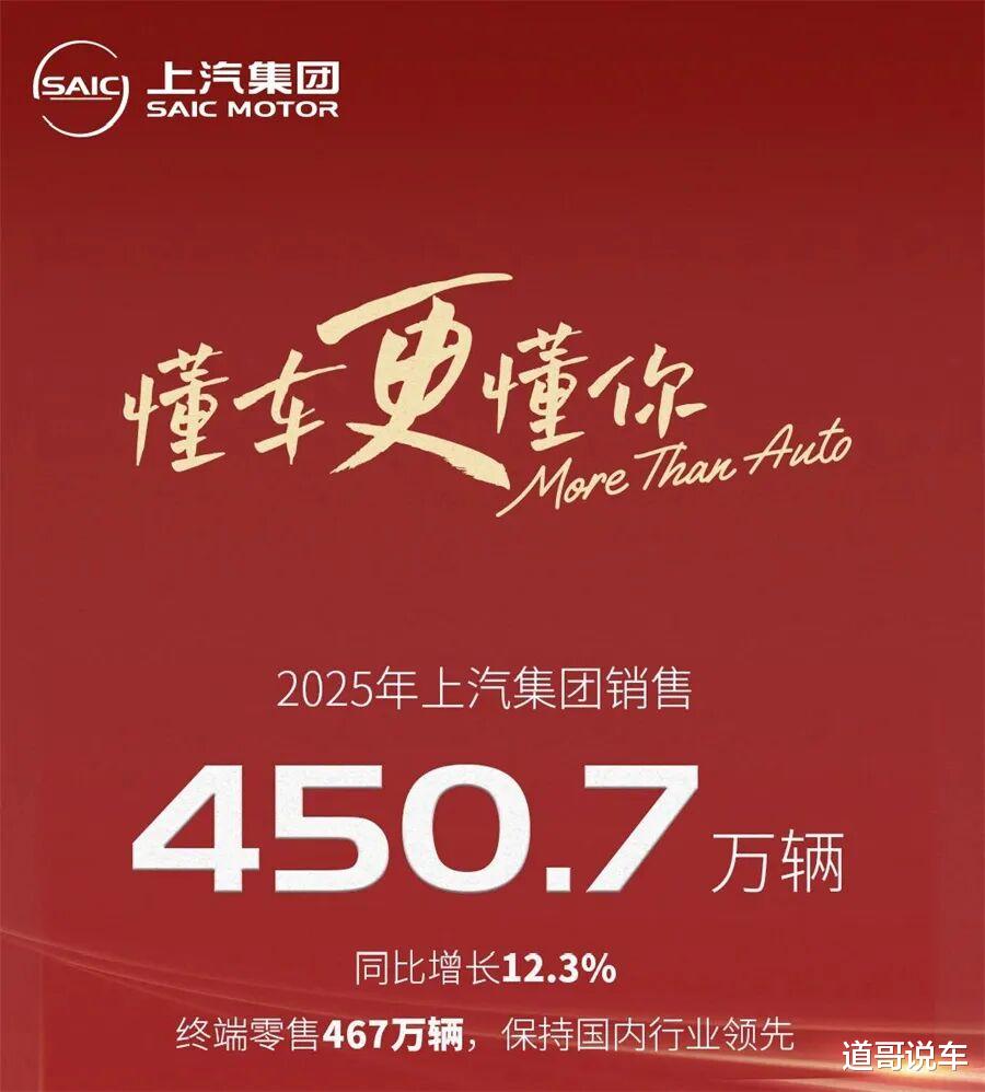 尽管同比增长438%到558%与上汽集团2024年利润的低基数有关,但2025年上汽集团的销量也是实打实的增长的。上汽集团日前发布的产销快报显示,2025年,上汽集团全年销量为450.7万辆,完成450万辆年度销量目标。甚至,考虑到其终端零售销量达467万辆,上汽在2025年是有机会成为零售口径下的销量冠军的。
