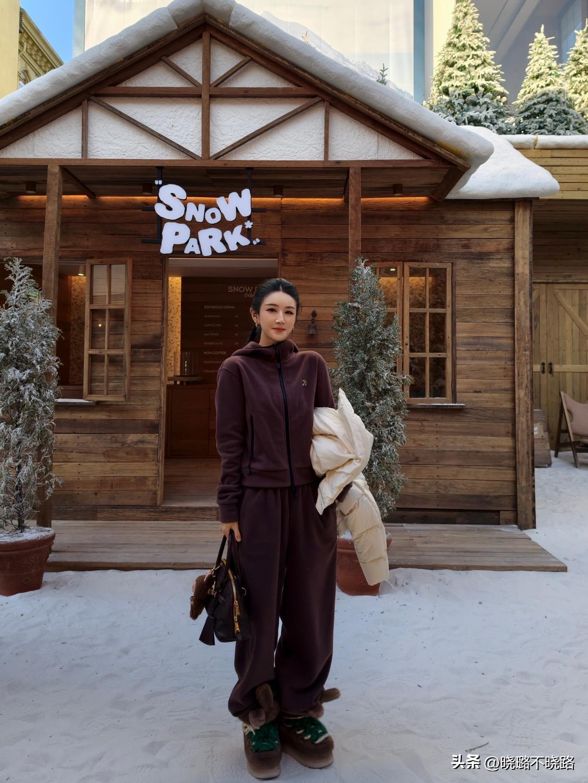卫裤的立体剪裁隐藏臀腿线条,卫衣的连帽设计兼备挡风御寒设计,脚踩深棕色毛绒老爹鞋,瞬间将休闲感转化为轻熟风。