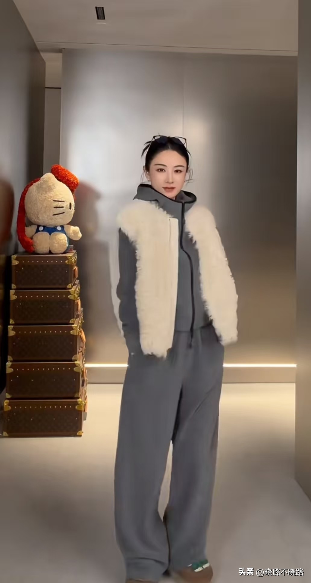 白色长款皮草的纵向线条拉长身形,灰色卫裤的宽松感则营造“外紧内松”的松弛美学。