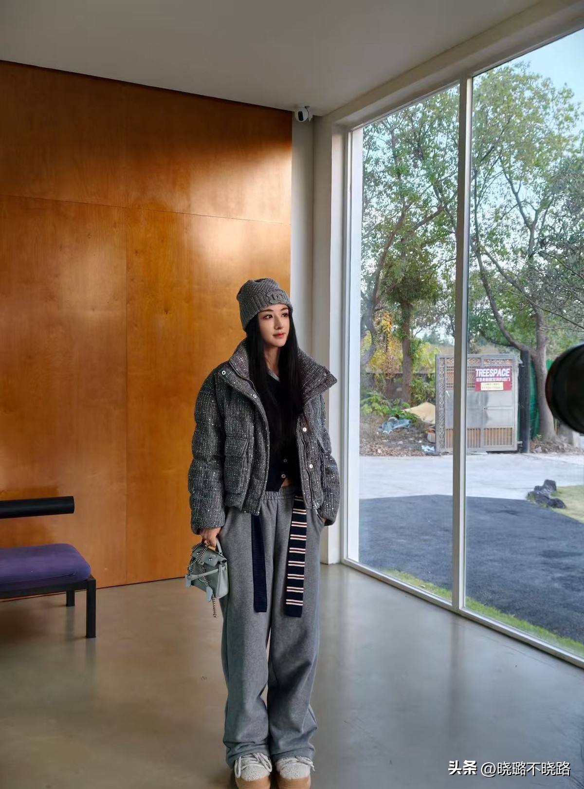 浅灰色亮片棉袄的细腻光泽与灰色卫裤的棉质哑光感形成视觉层次,同时亮片细节在光线中若隐若现,既保留卫裤的慵懒舒适,又通过亮片元素增添精致感,避免单调,营造出低调奢华的高级感,非常适合追求时髦职场穿搭的姐妹。