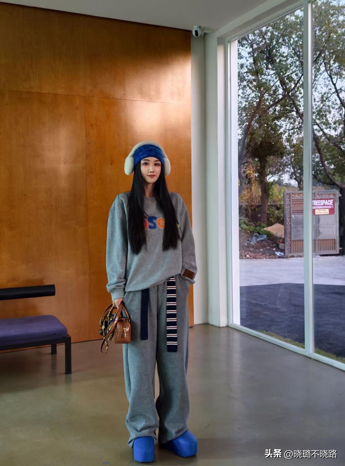 她用看似简单的灰调卫衣套装搭配宝蓝色的鞋帽,点缀上若隐若现的黑色条纹不对称针织腰带,成功勾勒出一幅充满活力的冬日街头时尚画卷。