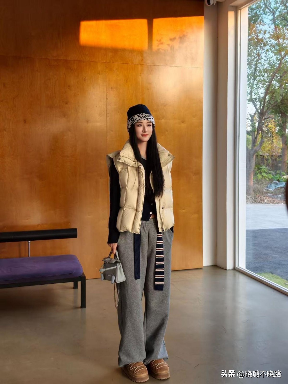 “马甲+卫裤”的搭配特别经典,也是出镜率非常高的百搭单品。