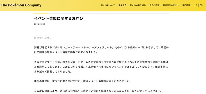 2026年1月30日,宝可梦公司(The Pokémon Company)发布中日双语致歉公告,称“宝可梦卡牌训练家网站”的运营机制是:拥有宝可梦卡牌认证资格的个人,可将其主办的活动信息刊登于该网站。本次的活动本就不宜举办,但由于确认过程中的疏漏,其活动信息被错误地刊登在活动页面上。“我公司在发现问题后,第一时间删除了相关信息,且该活动已被取消。本次活动信息发布后,收到了来自各方的反馈和意见,在此我们深表歉意。”同时,宝可梦方面称,今后将从根本上改变并强化活动信息的审查体系与确认流程,不断改善运营机制,杜绝此类问题再次发生。