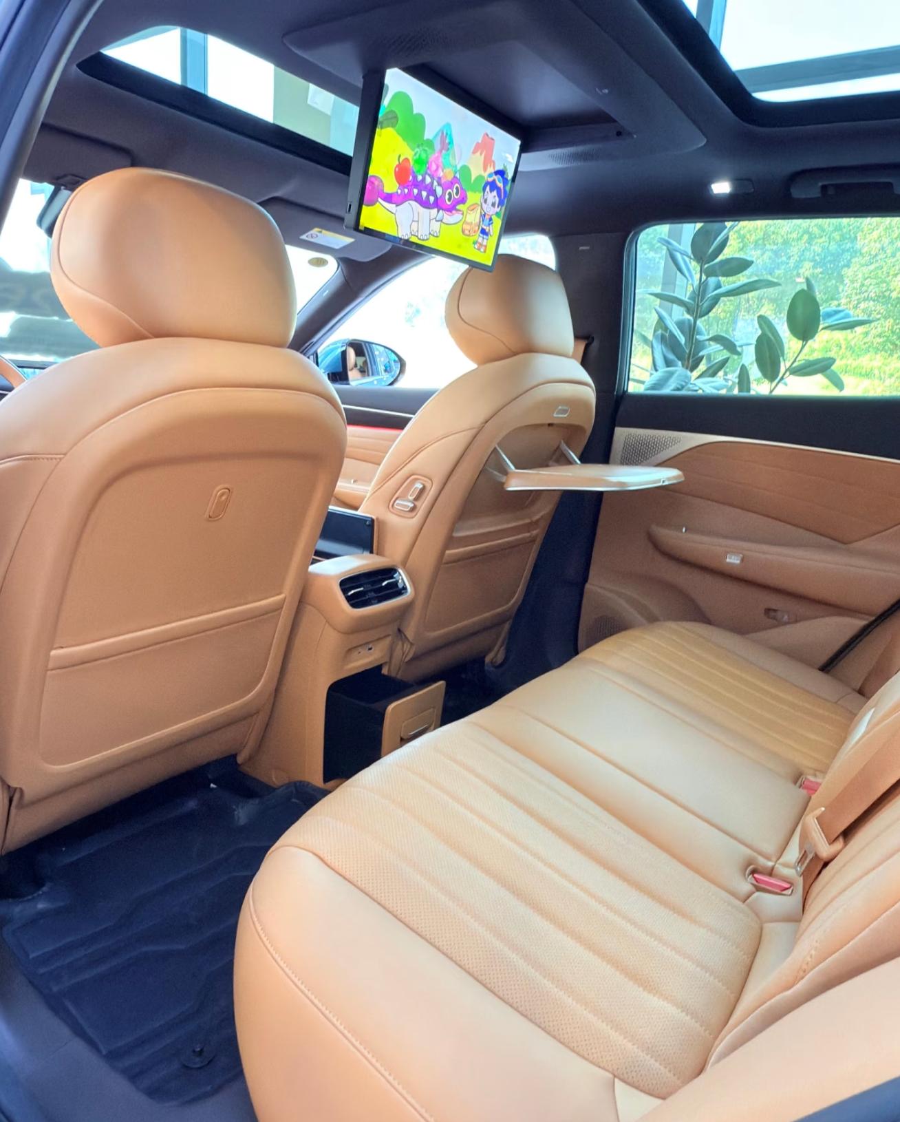 现场体验时,我发现了很多贴心设计。后排的小桌板展开后很稳固,销售说承重有10kg,给孩子放书包、零食都很实用。最让我心动的是后排那块15.6英寸的大屏,销售演示了语音控制,孩子说“你好风神,我想看动画”就能直接播放,这样长途出行时,孩子能安静地看动画,我也能专心开车。