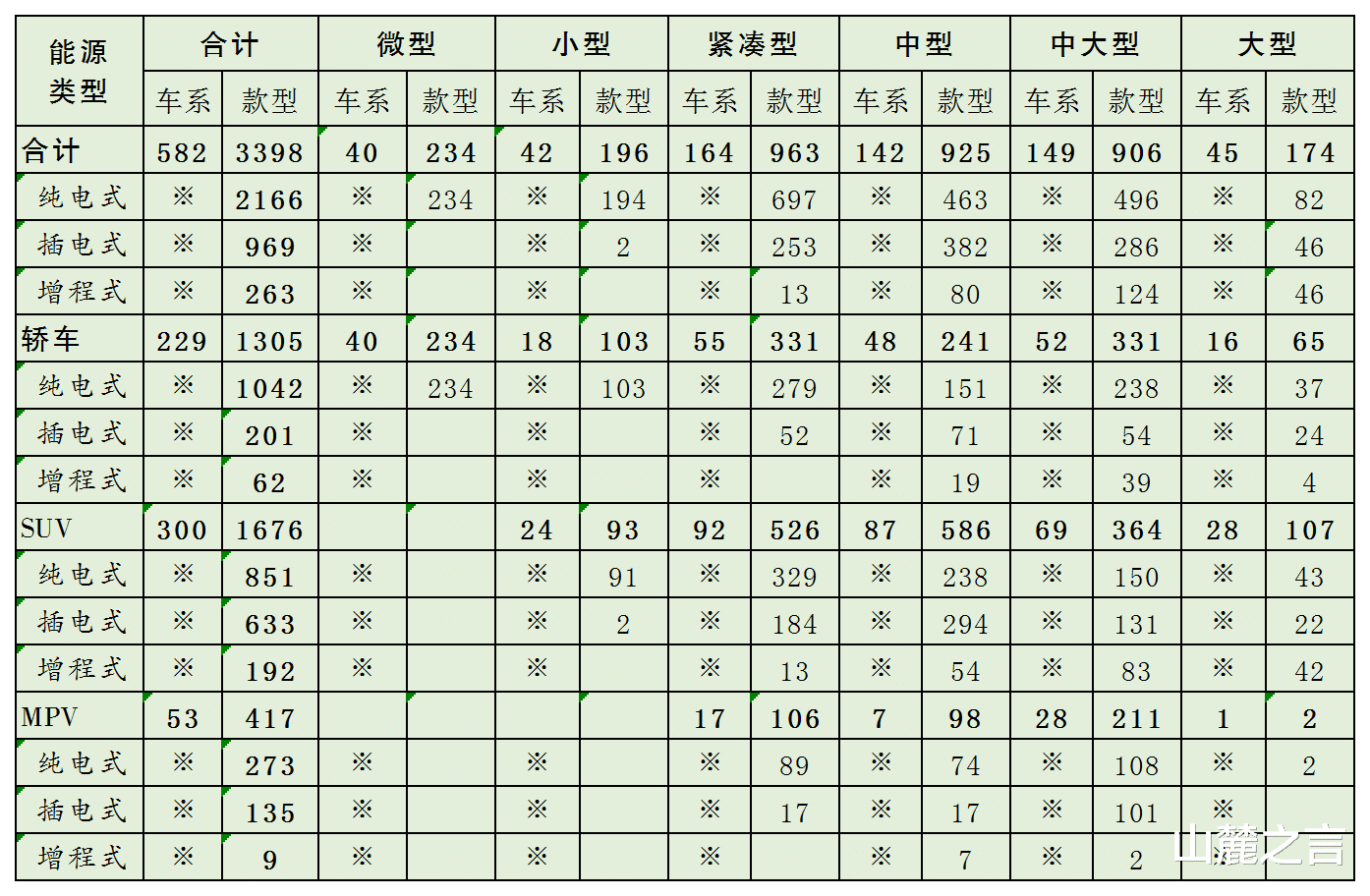 截至目前,国内新能源车共582个车系、3398款车型,占全部轿车、SUV、MPV共1217个车系的47.8%、7566款车型的44.9%,新能源车型占比近半。其中:纯电动2166款、占新能源车型的63.8%,插电式969款、占28.5%,增程式263款、占7.7%。总体呈现出纯电为主、插混为辅、增程补充的现状,但不同车型之间新能源类型结构存在较大差异。现简析如下。