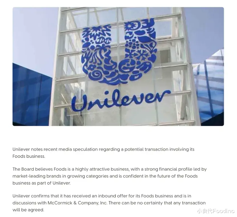 声明随后话锋一转表示:“联合利华确认,已收到针对其食品业务的主动收购要约(an inbound offer),并正在与味好美公司(McCormick & Company, Inc.)进行磋商。但目前尚无法确定最终能否达成交易。”