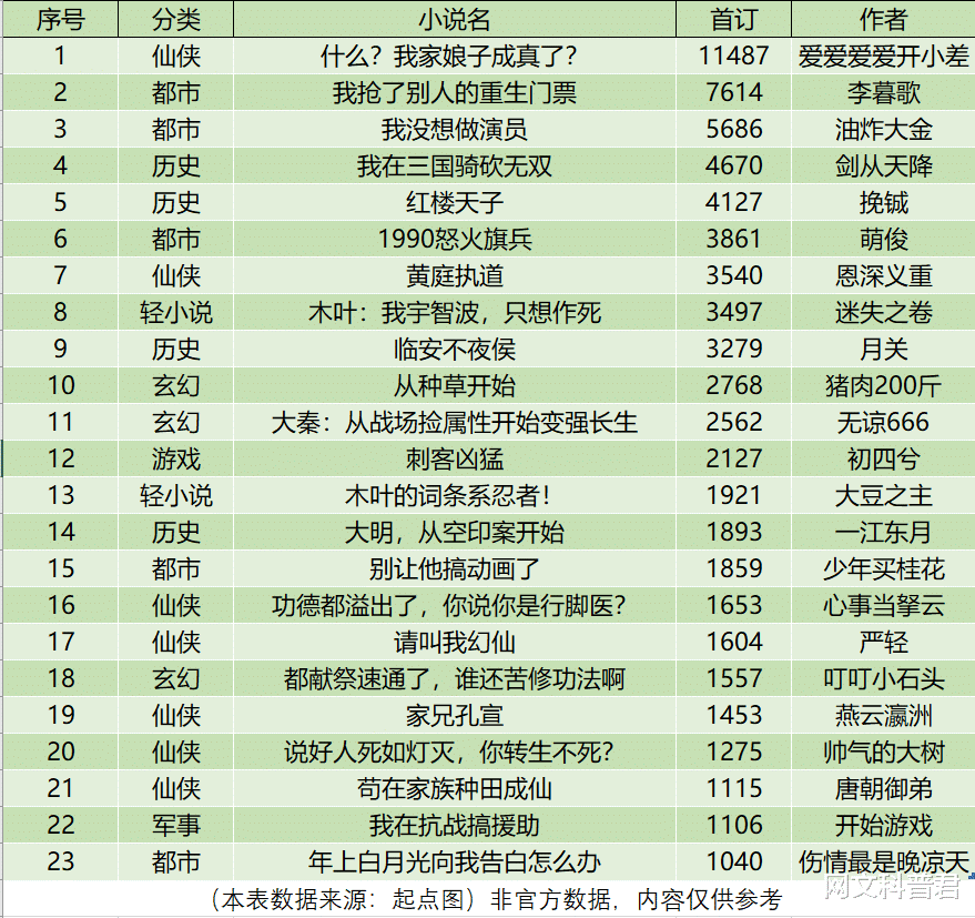 本周起点首订过千小说数22本,1本首订过万。接下来还是老规矩,简单挑几本给大伙讲讲。
