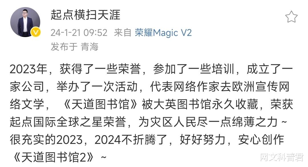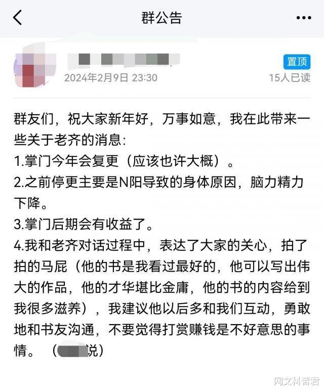 另外,由齐可休所著,断更一年的《修真门派掌门路》在书友群中发布公告称今年可能会复更。