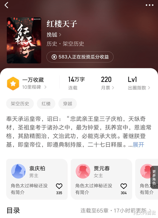 《红楼天子》,红楼同人文,本周首订四千,作者是新号挽铖,在红楼同人中成绩还算相当不错了,这本书主角魂穿成袁庆柏,应该是作者原创的一个人物,原著没提及的皇孙,是当今三皇子的儿子,虽说是皇亲国戚,但也不算啥,毕竟皇孙粗略一算就七十多个,加上主角不受宠。但在平民百姓富贾之家横着走肯定没问题,开局主角有意路过贾府赶巧遇上宝玉出生,也就是说时间线在故事开始前几年,起码离林妹妹第二次正式入贾府也还有13年左右,这个时间点贾元春都还在府里,还不是未来的贵妃。