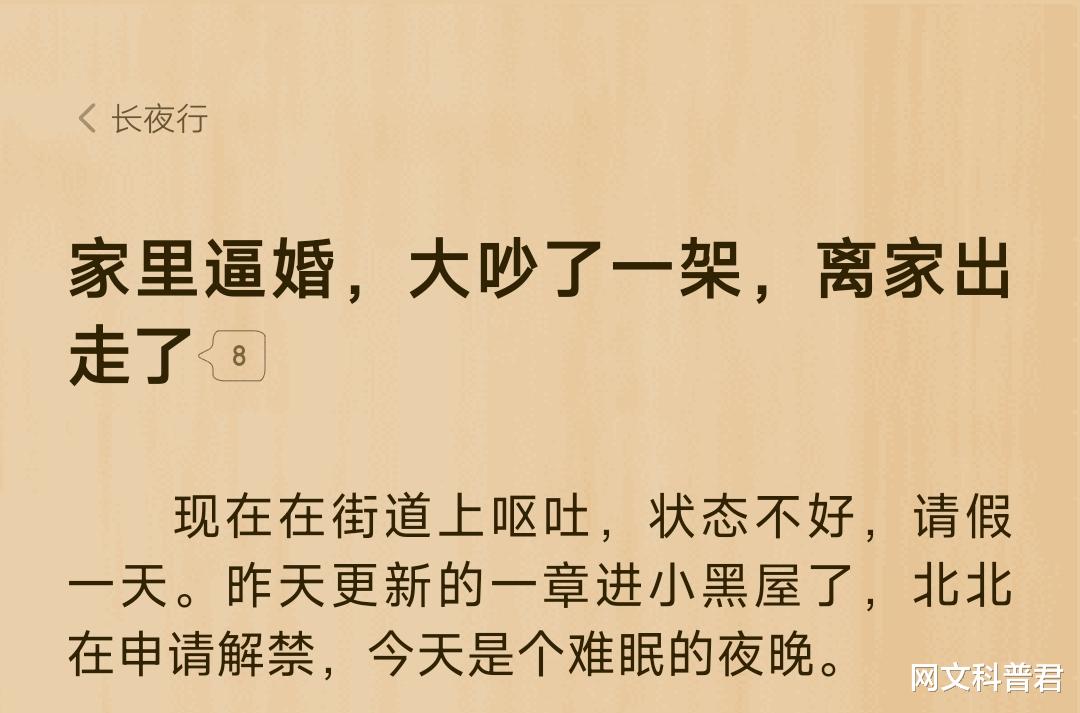 6日,起点《长夜行》的作者发单章称自己被家里逼婚,大吵了一架,离家出走了。