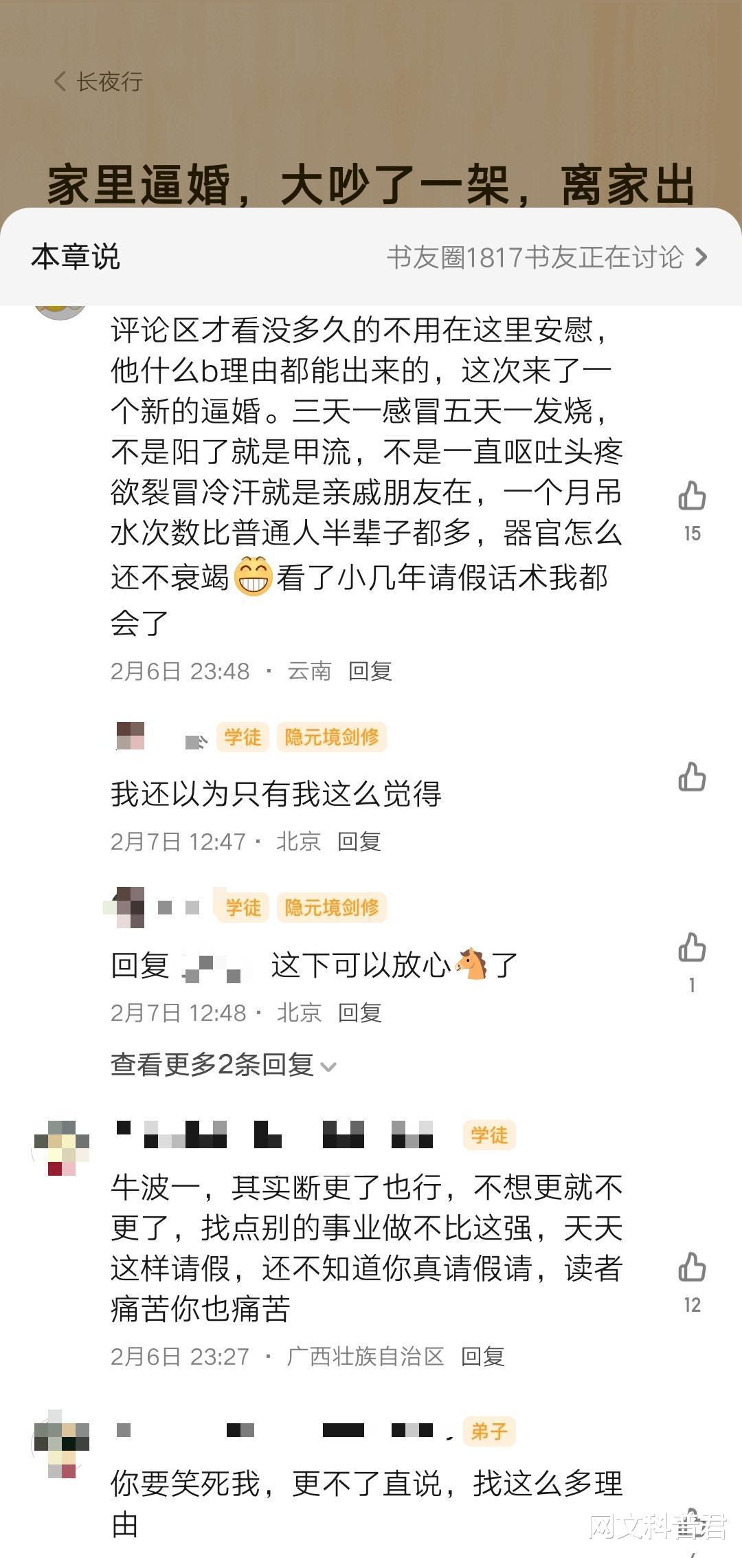 当然评论区的读者表示不相信,毕竟这作者请假经常是三天一小请,五天一大请,不是头疼脑热肚子痛,就是抑郁发烧肠胃炎,谁知道这回是不是为了断更找的托词呢。