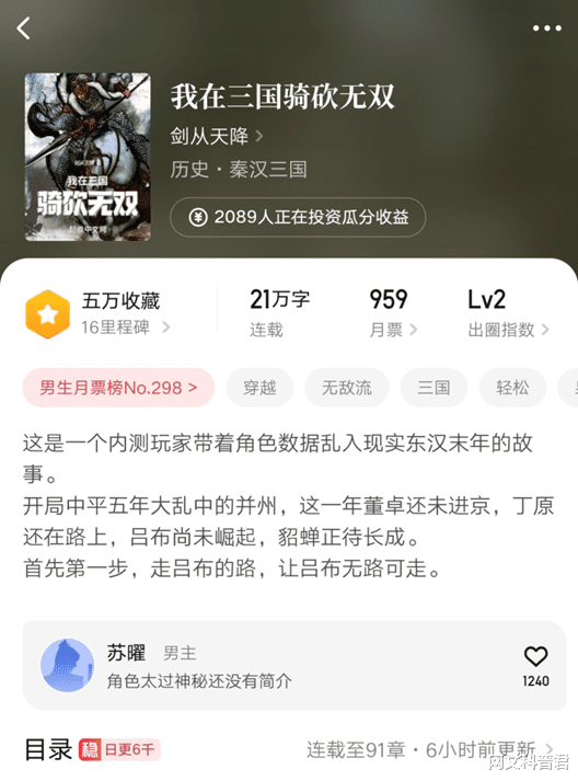 《我在三国骑砍无双》,这本书本周首订四千六,排名第三,作者剑从天降是新号。主角内测十年之后,正式进入《真三国世界》的角色扮演游戏,结果原来内测的档案没有被删档,主角直接加载了个开局满级的数据,之后主角就是一系列当游戏玩的操作,实际上主角就是穿越了,而加载过来的游戏数据就是他的金手指。