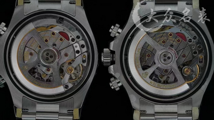 可以看出来纹路打磨丹东明显比上海细腻,但是差距没有丹东4130和上海4130之间那么大,上海4131对比上海4130打磨进步明显但仍不如丹东,并且上海机芯夹板比丹东偏暗,不是光照问题,我们图3调换两者位置,发现仍然是上海4131偏暗,应该是镀层工艺差距,两者均为斜面抛光倒角打磨,丹东倒角竖纹处理的更好,可以看到丹东刻字效果好于上海,上海依旧是假无卡度盖板(卡度还是有的,再背面可以在图中看出)丹东和上海4131机芯性能和返修率没有差距,只有打磨差异,丹东4131机芯打磨已经达到了正品欧米茄水平,日内瓦纹清晰稍逊于欧米茄,倒角水平差不多都是斜面抛光但是有竖纹,但是夹板处理的不及欧米茄干净,作为一个几千元档价位的手表机芯做成这样可以说非常厉害了!