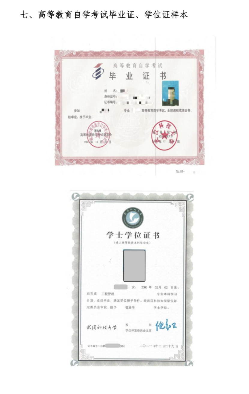 毕业证书:凡按照报考专业考试计划的规定,取得相应课程合格成绩且达到规定学分要求,毕业环节和实践性环节考核合格,思想品德经鉴定符合要求者,经本人申请且审核通过,由湖北省高等教育自学考试委员会颁发报考专业毕业证书,主考学校副署,国家承认学历。