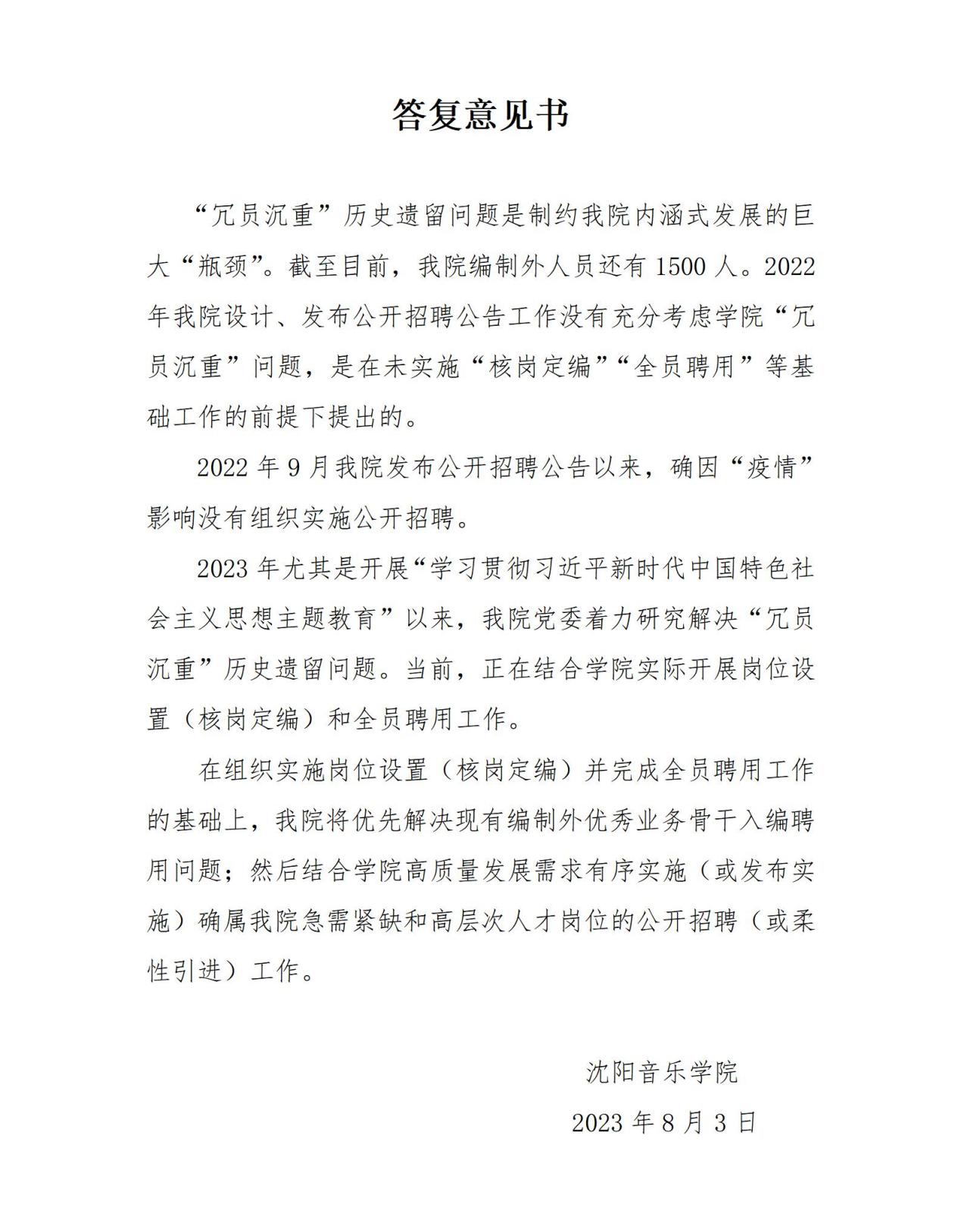 但是,《沈阳音乐学院巡视整改报告》中还说:抓好“违规调入1373 名编外自聘人员管理”问题的整改,正在组织制定《沈阳音乐学院2018年全员聘用方案》,……,年内将启动全员聘用工作。2018年到2023年,全员聘用工作仍然没有完成,时间过长,这不免让人对回复的理由有合理质疑,于是又以此为主要内容进行了多次举报。