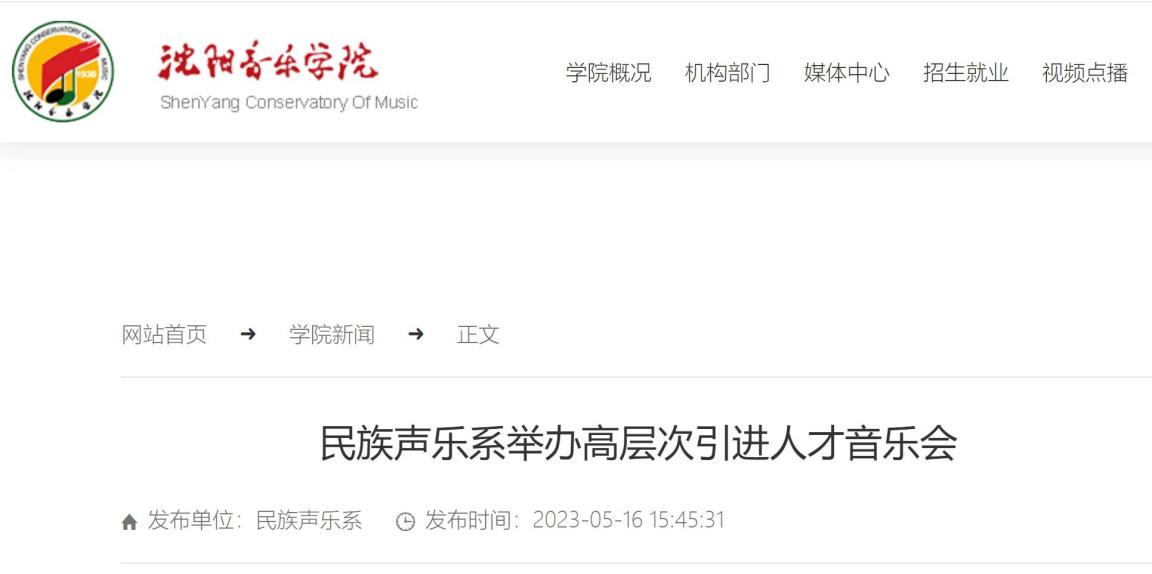 但沈阳学院官方网站2023年5月16日发布的新闻《民族声乐系举办高层次引进人才音乐会》内容显示,2023年5月9日,由民族声乐系举办的高层次引进人才音乐会在我院音乐厅举行。我院高层次引进人才、民族声乐系青年教师张某、李某为现场观众奉献了一场高水平的声乐艺术盛宴。