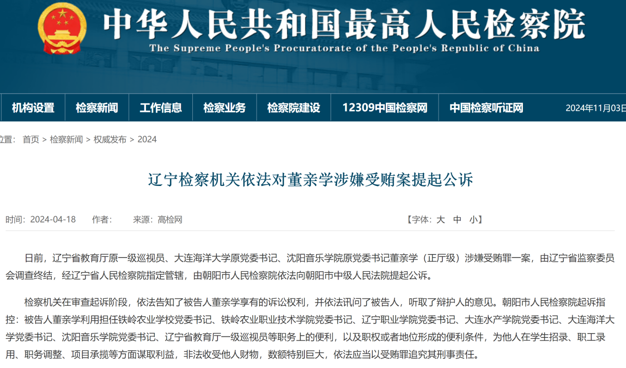 陈鹏举报信中提到的董亲学出生于1965年5月,长期在高校任职,曾任辽宁职业学院院长、大连水产学院党委书记、大连海洋大学党委书记等职。2018年12月,董亲学任沈阳音乐学院党委书记,2022年12月改任辽宁省教育厅一级巡视员。2023年8月,辽宁省纪委监委对其严重违纪违法问题进行了律审查和监察调查,调查终结后移送检察机关审查起诉,起诉指控中证实,被告人董亲学利用担任沈阳音乐学院党委书记等职务上的便利,以及职权或者地位形成的便利条件,为他人在职工录用、职务调整等方面谋取利益,非法收受他人财物,数额特别巨大。