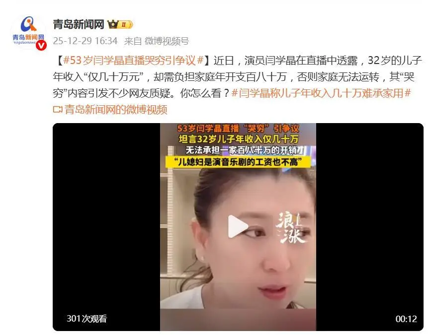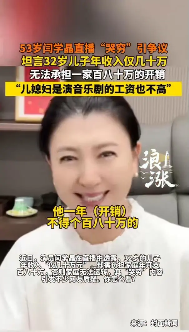 最近,53岁国家一级演员闫学晶的一场直播,直接把“明星的苦”送上热搜。镜头前她声泪俱下吐槽32岁儿子林傲霏年收入“仅几十万元”,在北京养家糊口根本不够花,自己带病直播就是为了填补家用。可这番卖惨言论刚出,就被网友扒出全家奢华过往,强烈反差让她彻底翻车,评论区满是“凡尔赛式哭穷”的吐槽。