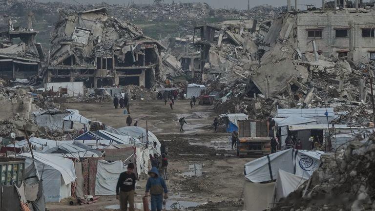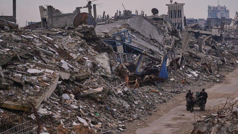 图片:巴勒斯坦人在以色列空中和地面行动摧毁的建筑物间行走。图片来源:美联社