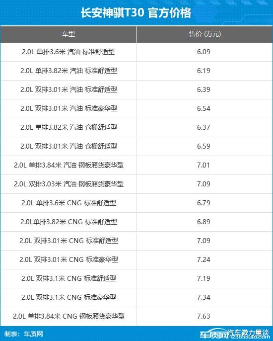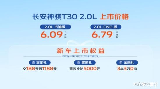 日前,我们从长安凯程官方获悉,长安神骐T30 2.0L正式上市,售价为6.09万元起和6.79万元起。新车搭载东安2.0L发动机,燃油最大功率110kW,燃气最大功率95kW。