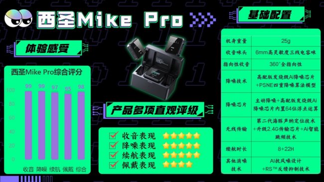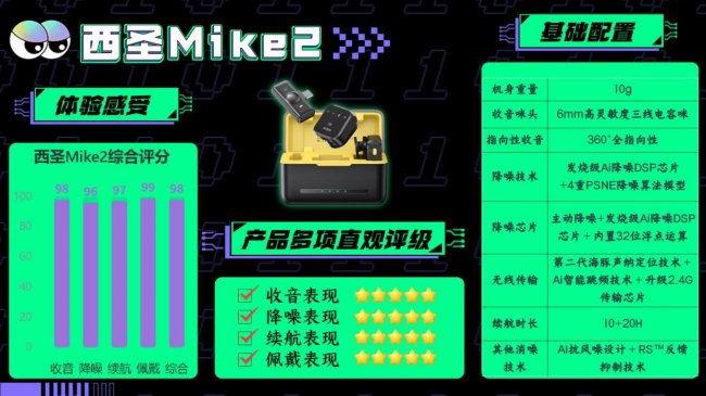西圣多年来坚持“发烧级”产品理念,致力于打造音质卓越的麦克风。西圣Mike2采用加强版全指向AI感知麦克风,内置高品质进口定制6mm音头,搭配32位浮点数DSP芯片,配合4重PSNE降噪算法和自研RS™反馈抑制技术,实现98%的声音清晰度和96%的抗噪性。研发阶段,西圣邀请3000多位用户进行音质测试,确保产品性能卓越。因此,西圣Mike2堪称“百元级无线麦克风天花板”。