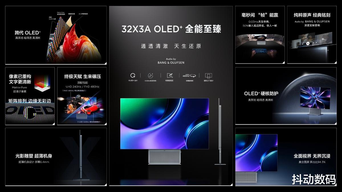 其中,“全能至臻”X3A系列定位高端群体。以 OLED+ 技术为核心,打造集画质、电竞、设计、音质于一体的一体式桌面体验。其色彩表现极为纯净、鲜艳且精准,sRGB、DCI-P3两种色彩模式下均能达到99%的覆盖率。行业最高规格的4K 240Hz双模面板,能一键切换到480Hz超高刷。X3A还解决了OLED文本显示的短板,通过采用更高清的矩阵像素排列,确保文字显示清晰无彩边,对于长期从事办公、阅读、代码书写工作的用户而言,这无疑是实打实的体验升级。“星际之门”的美学设计,屏幕仅6.4mm的超薄机身让桌面品质时刻在线
