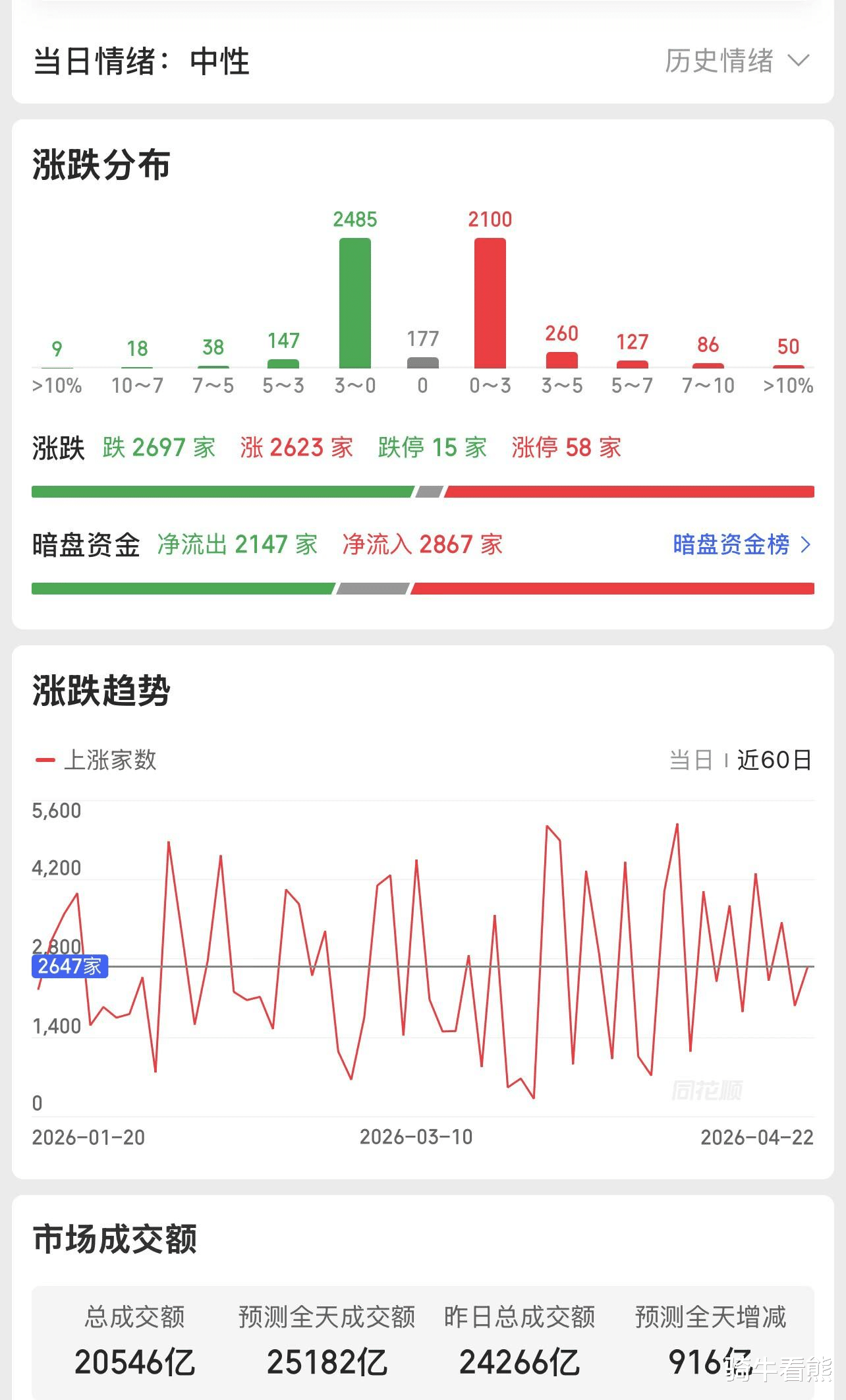 美股出现冲高回落的走势,这与市场预期有重大关系,“特朗普宣布延长对伊朗停火”这对于市场来说“有点失望”,当大家都期盼着“战争结束”时,结果预期被打乱,这就导致了不确定性因素在增加,甚至有可能会进行“二次打击战争”,所以金融市场应声下跌。A股市场开始震荡向上,走得很慢就好像“小宝宝”在爬一样,走着走着还喜欢回头(回调)看一看,但是整体是向上的,现在最大的问题在于赚钱效应较差,这才是缩量上涨的主因。