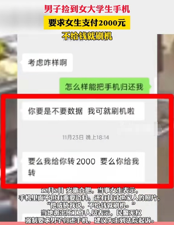 近日,安徽合肥。一女大学生在餐馆吃饭时将手机遗留在取餐窗口,随后被另外一男子“捡”走。女子找不到手机后报警,警方给了女生男子的联系方式,女子在交涉的过程中被要求给2000块钱,否则刷机处理。(信息来源:长城新媒体)