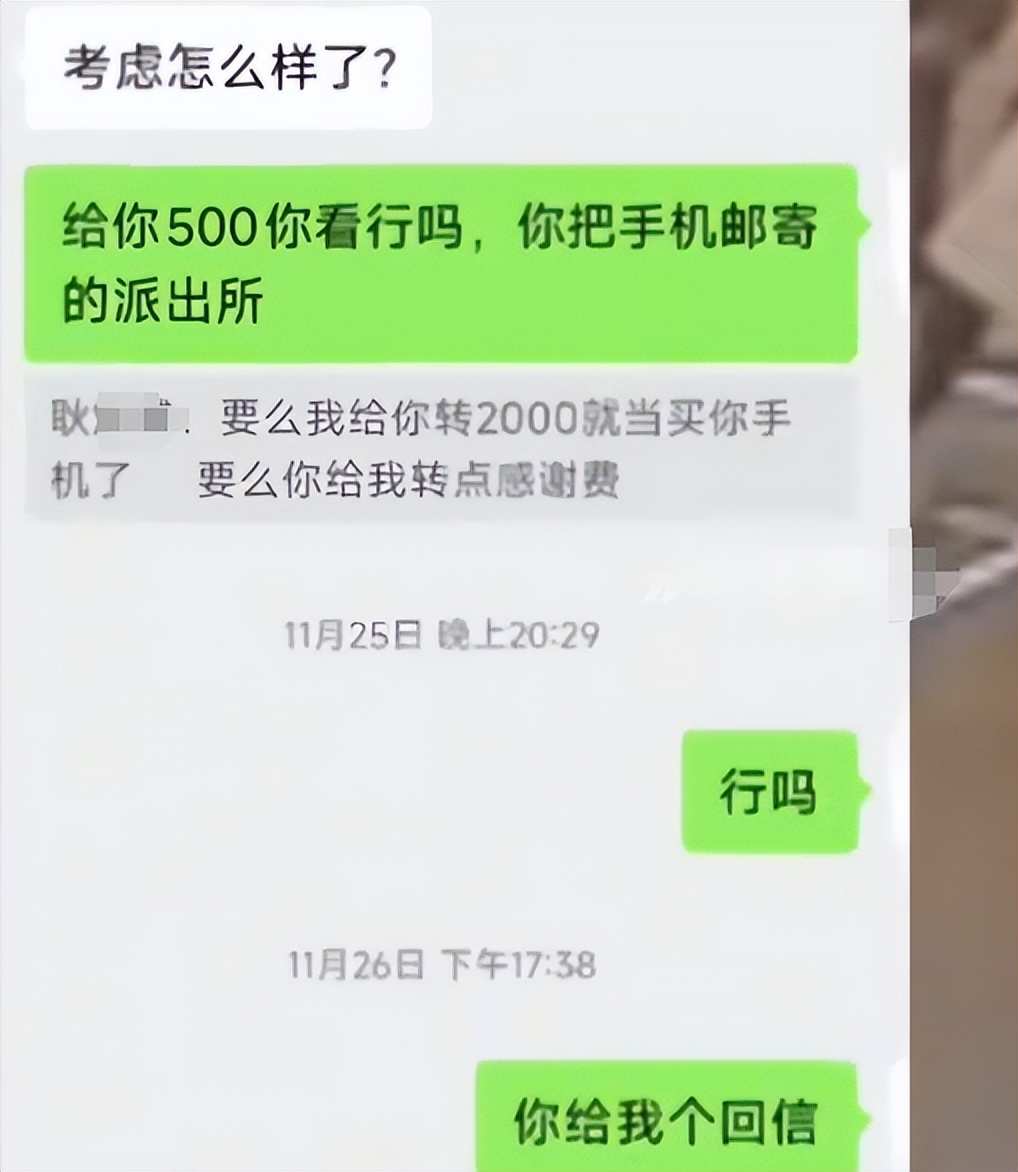 警方找到了耿某的联系方式交给了女生,女生在联系耿某的时候,耿某提出了两个女生无法接受的处理方案。方案一是耿某给女生转2000块钱,手机就归他所有了。方案二是女生给耿某转2000块钱,男子将手机寄回给女生。