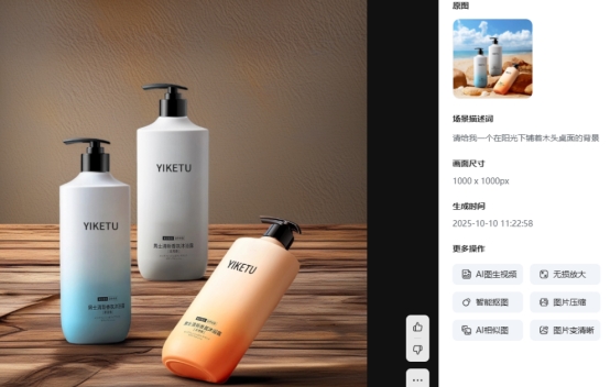 第二步:主图背景生成。 通过易可图AI商品图功能,我们可以将抠好的产品图,放入一个场景中,你可以选择一个和产品色调相符的背景,进行合成,AI会自动填充光影效果,让的产品看起来立体、高级。