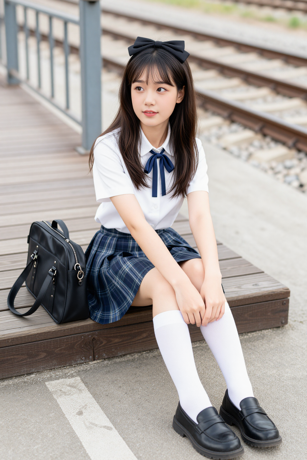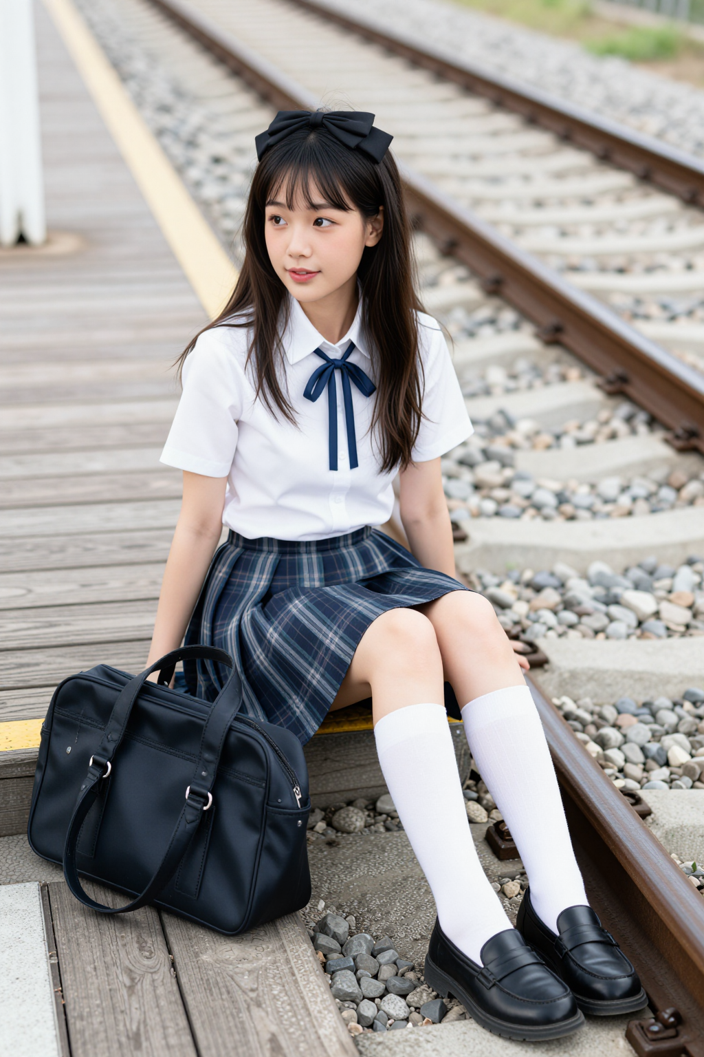 A字版型的蓝系格纹百褶裙是点睛之笔,经典的格纹元素注入了活力,A字版型巧妙修饰胯部和大腿线条,裙长控制在合适范围,兼顾利落感与实用性。蓝系下装与同色系领结形成呼应,让整体造型更显协调统一,日常搭配乐福鞋或小皮鞋,就能打造出清爽又不失细节的日常造型。