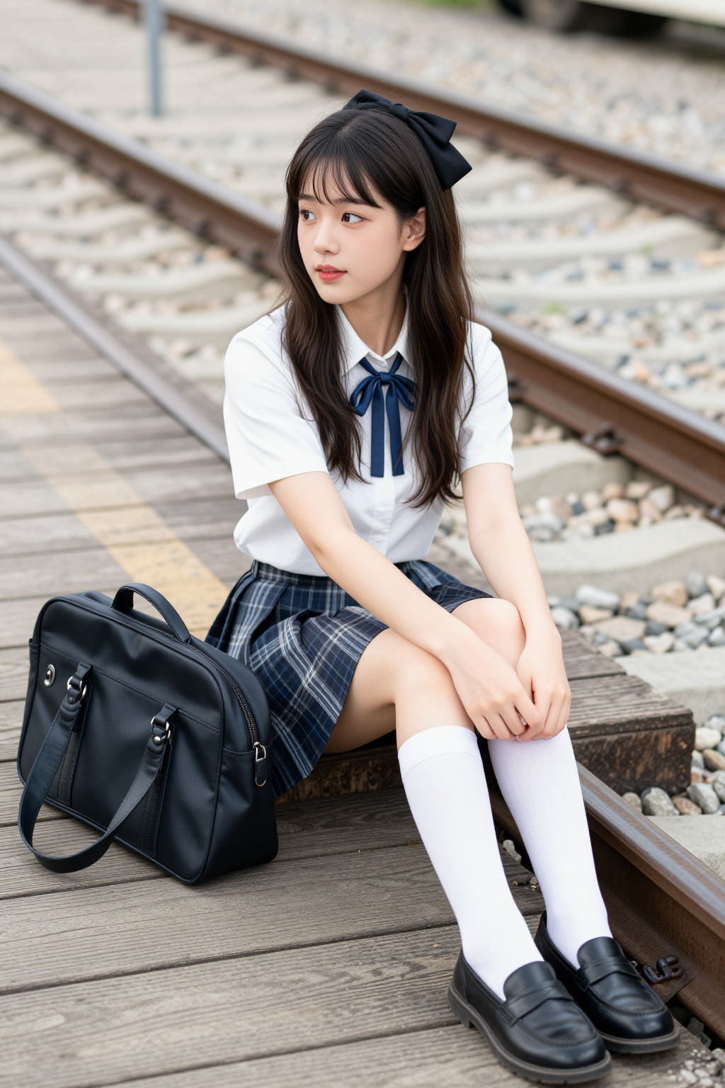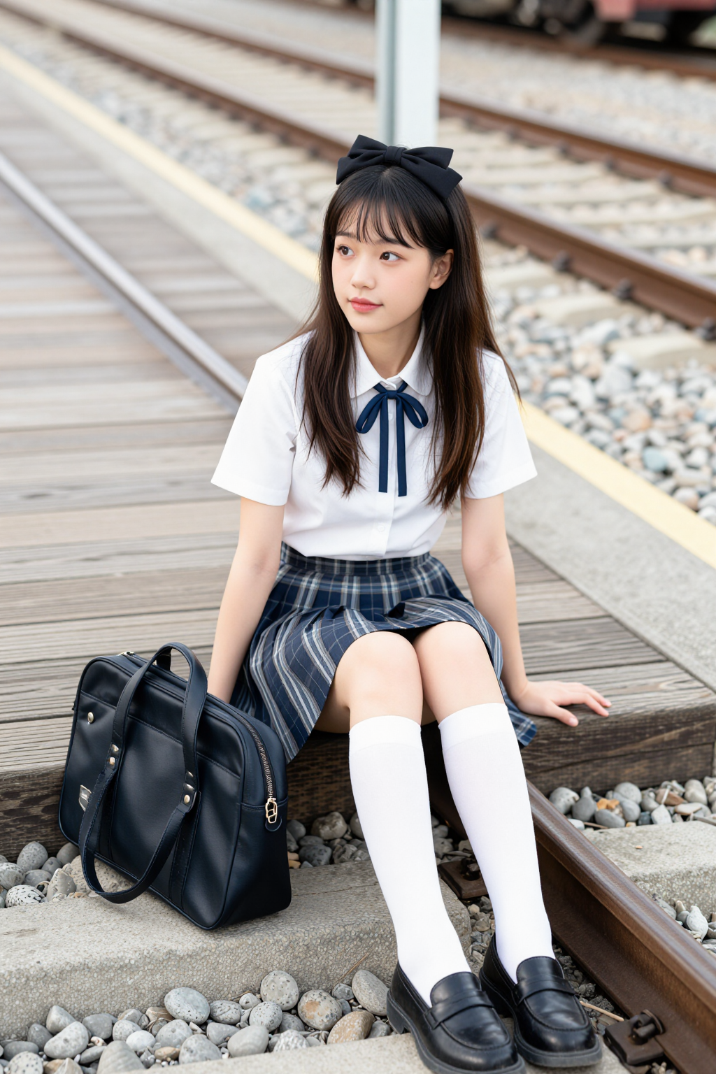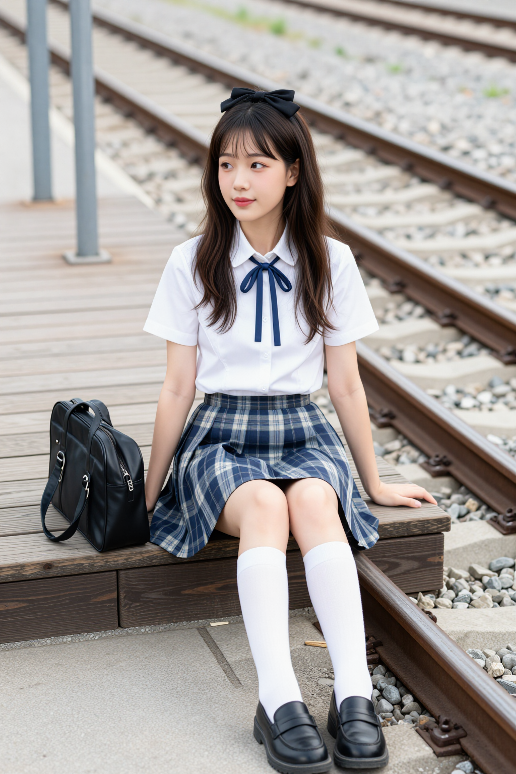 搭配白色中筒袜,既能增加层次感,又能优化腿部比例,让整体造型更显修长。黑色乐福鞋提升了整体造型的质感,同时与格纹元素形成对比,让整体风格更加平衡。深蓝色包包作为配饰,既实用又能提升整体造型的精致度,让整体搭配更具完整性。